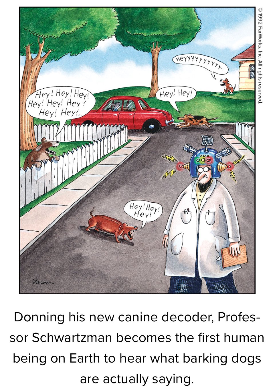 “Donning his new canine decoder, Professor Schwartzman becomes the first human being on Earth to hear what barking dogs are actually saying.