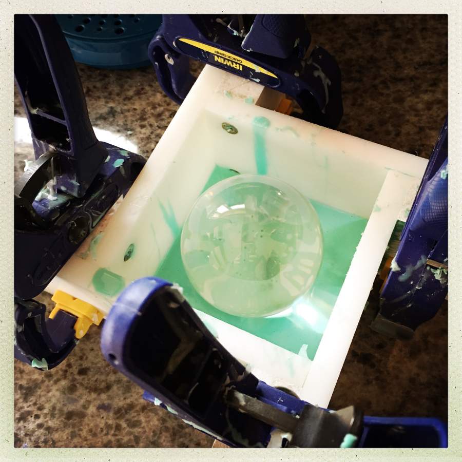 The pocked surface of the ball is because of a weird thing I discovered in this experiment: bubbles in silicone normally are bouyant enough to float up to the surface, moving around objects, but the angle of the ball was not oblique enough, so all the bubbles stayed. It’s not that the ball is bubbly: the mold from the first ball is bubbly.
