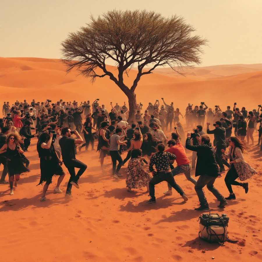 Krea AI and mjr: “the crowd of influencers fight in the desert to photograph the last tree.”