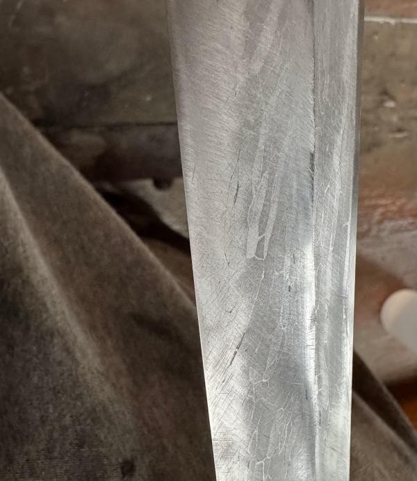 And, of course, it told me what I should have expected, which is, since this is a process developed by the Japanese there is an infinite stack of layers of things you have to do in the right order, precisely, or you’ll have a scratch specific to step #8 which will be unremovable unless you go back to step #6. Not quite, but, maybe I am not entirely joking. Anyhow, it turns out that I’m pretty close to being able to go for a final polish, but any scratches I missed 3 steps ago will re-appear with little LED spotlights on them and a Rammstein stage show. I have come to understand, though, why a Japanese-trained master swordmaker can be handed a modern sword made by some well-meaning guy on the internet, and they just smile, “yes, indeed” and pass it back.