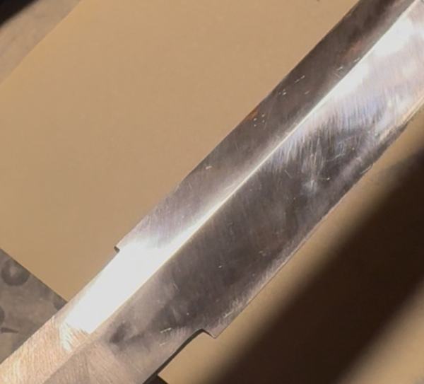 Well, well, well, – you can see the temper line on the left, because it’s much more deeply scratched than the right near the ridge-line (shinogi-ji) You can even see the hardness transitions in the flat. And you can see on the ridge-line that there are places that I simply haven’t hit on yet. I could give you a 4 hour lecture from that one photo, but I won’t. Anyhow, the edge, inside the temper-line (hamon) has scratches going in different directions because it has been hit with a variety of tools on the harder metal than the flat. So it’s more burnishing the finish than polishing it. See there are angled strikes, which are probably from the belt sander long ago, and straight deep ones most likely from a diamond stone. The ridge-line also carries hard-edged strikes, again probably that diamond block. But what about the shiny area with the diamond strikes? That’s an area that a lazy sword-polisher missed. So, what you do is start polishing the flat, but push your intentionality toward the shinogi-ji. After a bit, the line there becomes as sharp and as crisp as your stone is straight and flat. Please read that a few times. It took me dozens to write, so you owe me. Now look at the very bottom of where the shinogi-ji is leaving the picture frame – there’s an area that’s sharp and crisp on the flat/edge side but has an un-matte area on the other side. Well, if I polish with just a few strokes with my intention on the shinogi-ji, that line will pop off the surface like it was made on a CNC machine and polished with conspiracy theory dust. Like: