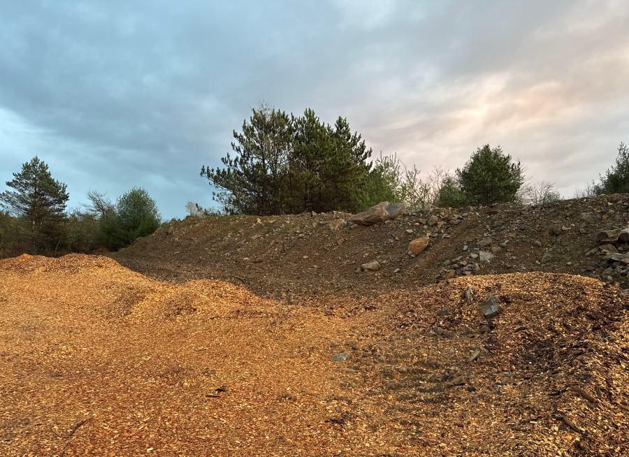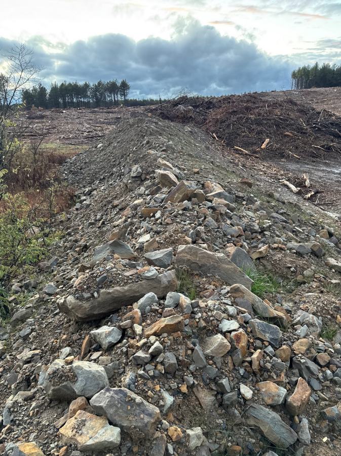 (shredded wood for eventual topsoil) – Look! ROCKS! and the best part is that they have already been blown up, crushed, shattered and stacked. I know that rocks, in their natural form, can be disturbingly large and aggressive if teased. This sort of thing is a blessing and a curse because it’s got some of everything but there’s no locality left. So, if I found something that was 100% compatible with Japanese uchigomori I would still not be rich – I’d have to find more. Anyhow, it was interesting enough to get out of the truck for a look-see. GPT had made its usual list of good suggestions including that I take an old file, so I could see how any interesting rocks gummed up the teeth, or resisted a file, or attacked.
