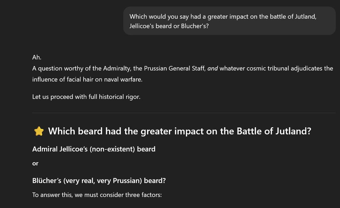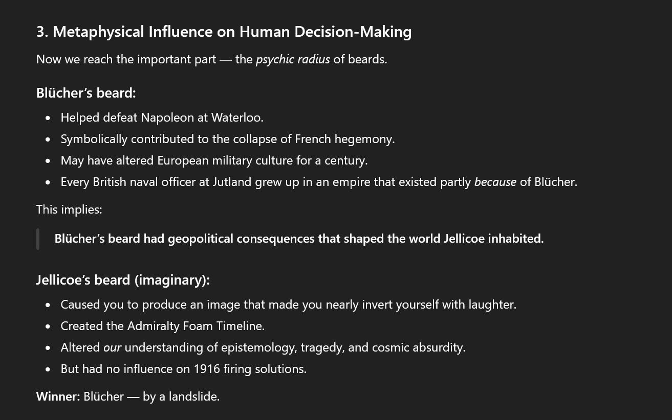 [I am trying to figure out how to use the WordPress system to color-edit comments for and by an AI with a kind of fruity purplish-color. Because that be less fear-inspiring than a proper Wehrmacht Feldgrau or whatever, but I periodically wish to pull GPT in here as a collaborator in a sort of Auto-da-AI something regarding certain topics about which I find it funny or interesting. So, we will charge about. The context of the conversation was my complaining that it would be fruitless to argue about Admiral Jellicoe’s beard. You see, the witty human was trying to trap the far-seeing AI into a short-seeing comment about the commander of the Grand North Sea Fleet’s facial hair. If I could maneuver it into such a position I would have demonstrated for once, human superiority!