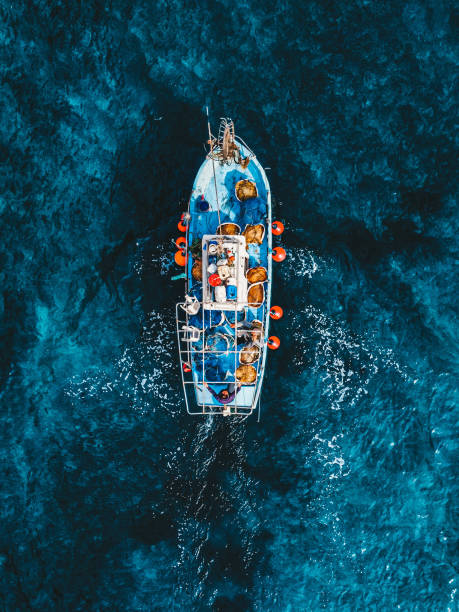 Top view drone aerial photo of fisher boat sailing Cyprus Mediterranean Sea.