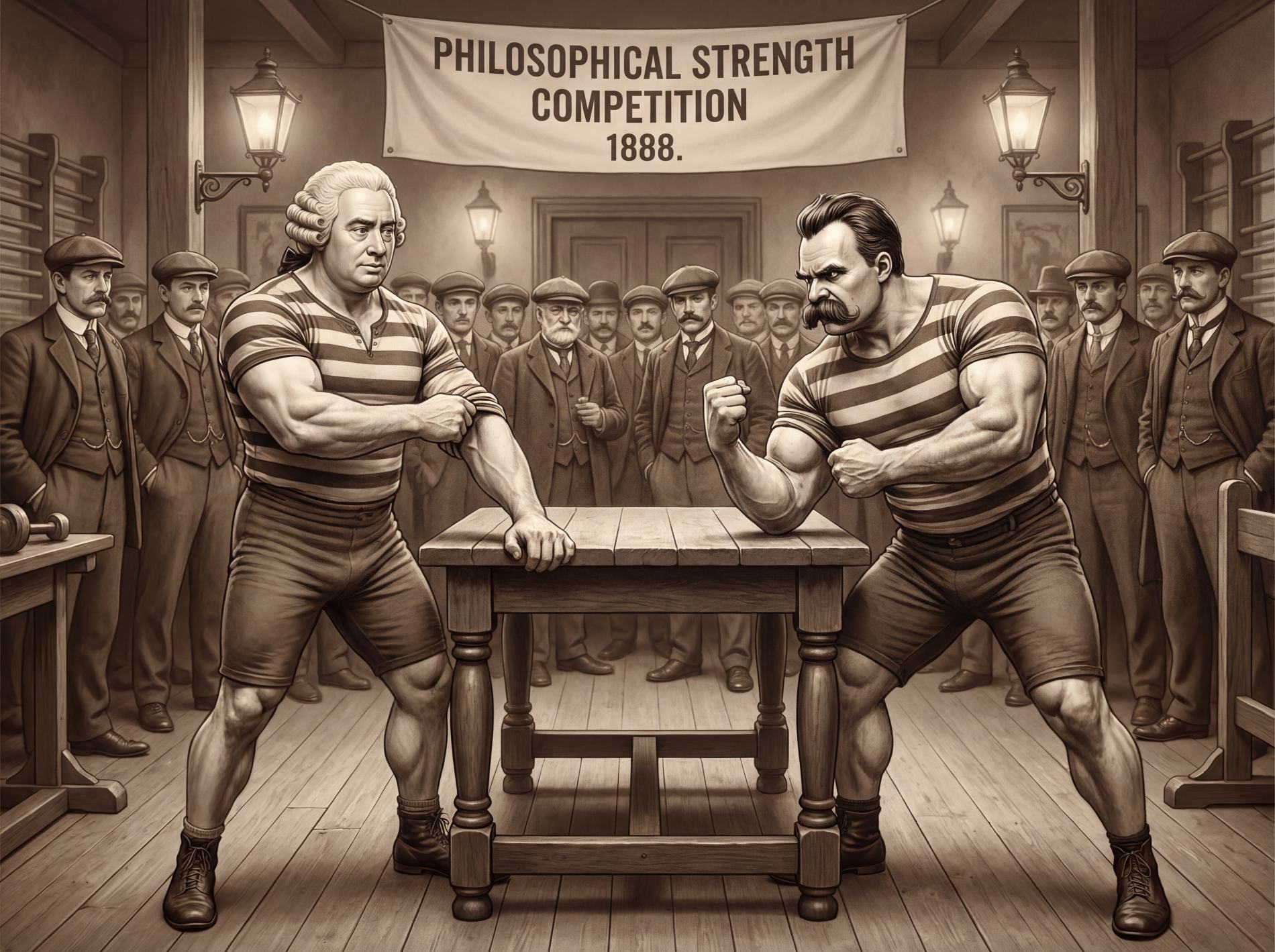 Nietzsche had been thrashing around and done some significant body-blows to aerial phantoms, when somone – in this case let’s imagine it was the man him himself – began dropping Humean empiricism on him. “Fred,” the big guy said, “I can see you’re upset but that upset your feeling – that’s your own inner state. God didn’t upset you, you did.” Fred’s eyes started to bulge, “No seriously,” said David, “the creation of inner states like ‘anger’ are ourside of my ability. I know you look pissed off but what happened is you’re listening to me, and the things I am saying are causing to you look at your own thoughts and get pissed off. I’m not calling you a sloppy thinker, I’m just saying you’re getting pissed off by someone’s sloppy thinking.” Over at the bar Epicurus topped off Socrates’ glass and they clinked the rims, listening without interrupting themselves.