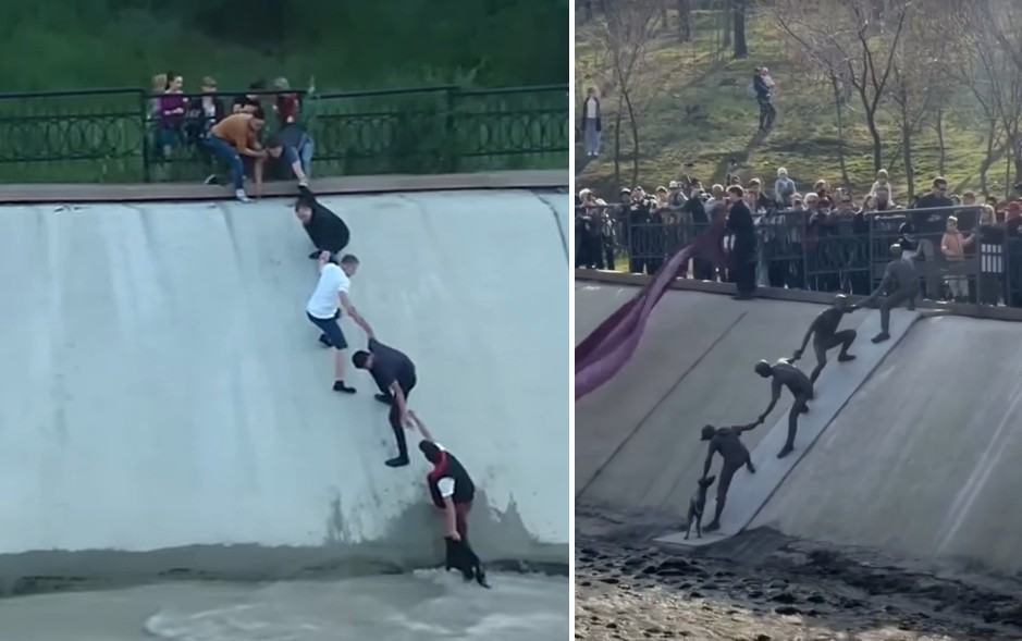 In 2016, a dog somehow managed to get into one of the feedways for a reservoir in Almaty, Kazakhstan. The dog was probably doomed since the water was very high. But a man jumped down the slope and ran to the dog, then ungracefully hauled it to the side of the feedway, then discovered that neither of them could get up.