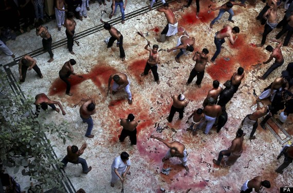 Ashura. The tenth day of Muharram, the first month of the Islamic calender. This date is important to Shi’a Muslims because of the anniversary of the death of Husain, the grandson of Muhammad. During the self-flagellation ceremony, men beat themselves, hit their backs with chained knives and cut their heads with swords as they mourn.