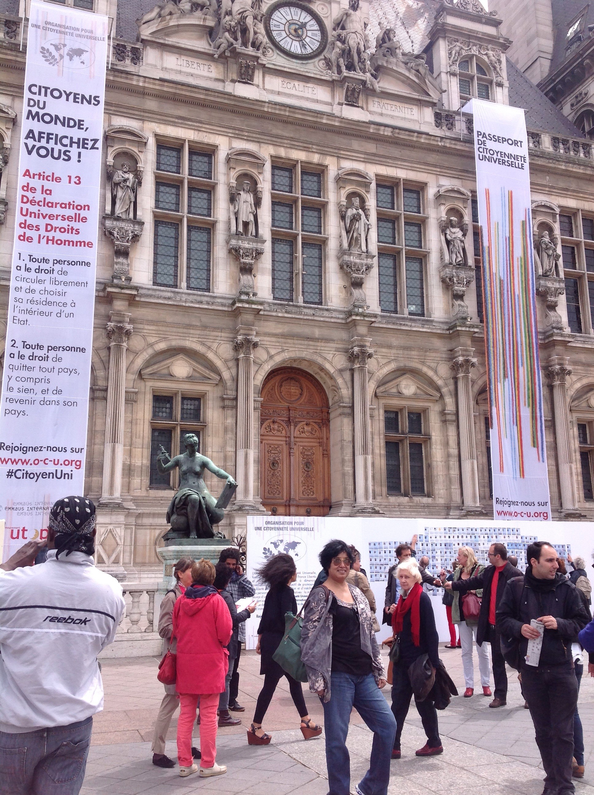 So, from the 21st to the 23rd of May, hundreds of people who walked past the Paris City Hall, and dozens more through internet’s hashtag #CitoyenUni, were able to take pictures of themselves in a replica of Universal citizenship passport, to show their support for this ideal. We then printed the pictures and glued them on to a seven meter wide banner, showing a small visible part of today’s universal citizens, fighting against the mainstream anti-immigration ideas being diffused through the media, swimming against the tides. The rainbow of faces on the banner finally made it obvious that in 2014, hundreds of individuals of all origins, genders and ages, are still ready to show support for migrant’s rights and for the principles of Article Thirteen of the Universal Declaration of Human Rights: